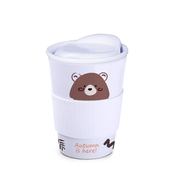 Henkelloser Porzellanbecher mit Kunststoffdeckel und 45mm-Silikonbanderole für alle Freunde von nachhaltigen Produkten. Silikonbanderole in 8 Standardfarben erhältlich.