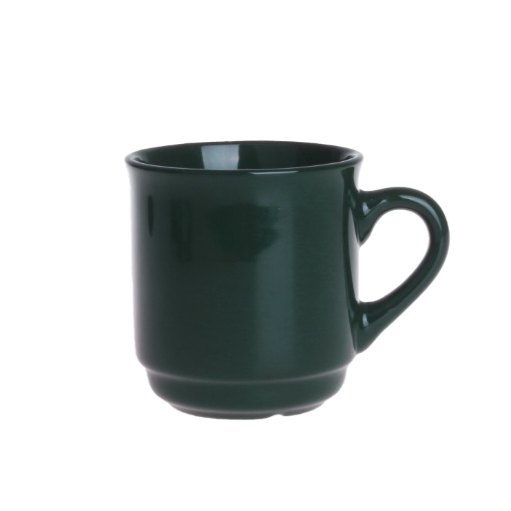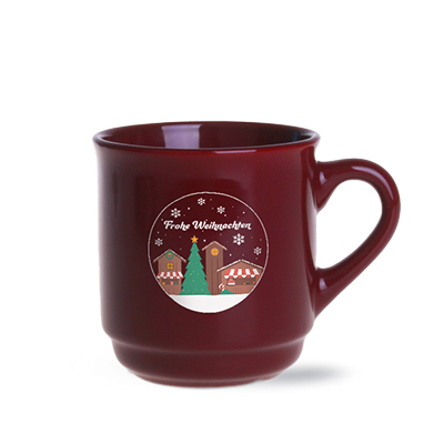 Ein Becher, der speziell für Weihnachtsmärkte entwickelt wurde. Er hat eine klassische Henkelform und einen zylindrischen Korpus, der das Stapeln ermöglicht.